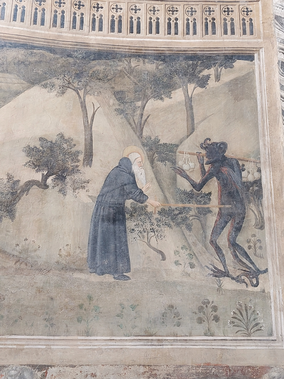 Nell’affresco intanto si riconoscono alcune essenze, con molta probabilità, caratteristiche dei nostri ambienti. Se si guarda attentamente sulla sinistra si possono notare due querce, precisamente il primo albero sulla sinistra e il terzo. Tra le due querce c’è forse un melo, riconoscibile sia per le caratteristiche foglie ovate nonché dai piccoli frutti in trasformazione (se ne vedono 3 o 4 sui rami tra la casetta a sinistra e il santo frate).