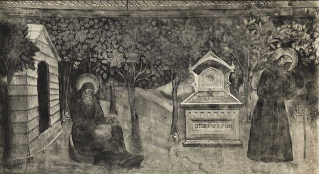 Abitatori solitari popolano queste immagini, immersi in una natura talora brulla, mentre sono intenti nei lavori fisici e mentali. Nell’atmosfera rarefatta e scarna del paesaggio naturale si inseriscono con facilità di lettura scene allegoriche che danno forma visibile all’immaginario mistico del medioevo: un eremita traina un carretto con un leone addomesticato, simbolo del dominio della propria parte ferina; un monaco benedice alcuni animali, mentre incombe su di lui un demone prontamente fronteggiato da una presenza angelica; altri frati sono intenti a mescolare calce per la costruzione di un edificio, incalzati da un asino gravato da pietre. In un’altra scena il difficile lavoro di meditazione e preghiera è continuamente infestato dalla presenza di un diavolaccio che tenta un monaco visibilmente pensoso e affaticato.