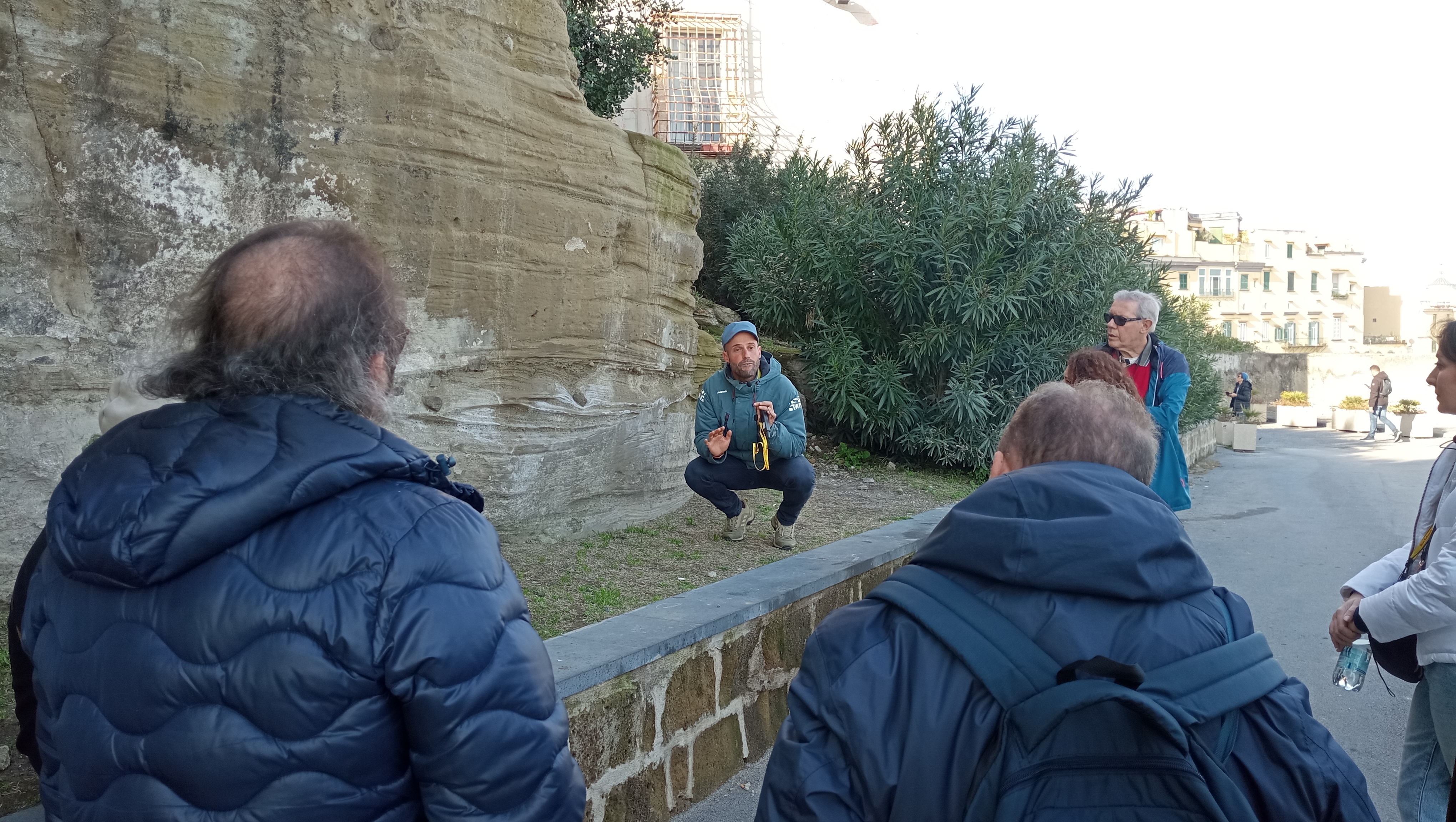 Arriviamo infine sul belvedere di Monte Echia, una delle emergenze vulcaniche più antiche della costa napoletana. Oltre ad un panorama mozzafiato sul Vesuvio e sul golfo di Napoli, restiamo ammirati da affioramenti rocciosi che ci mostrano strati di ceneri e lapilli e “bombe vulcaniche”. Appena poco lontano i resti dell’antica dimora romana di Lucullo, circondata all’epoca da giardini lussureggianti. Ed ecco che riaffiorano le antiche radici rurali, vulcaniche e storiche della città.